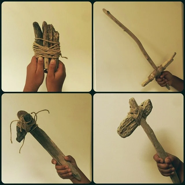 My kids gathered their godsiblings (at the East Bay Waldorf School) a "pasalubong" (Tagalog for "present from my travels") of beach wood & dried seaweed in a crocheted grocery bag. In our minds, it was to build menehune (island sprites) homes. Here's what they did with it first: a raft, sword, tomahawk, & hammer. You can see more of their creations on Instagram.