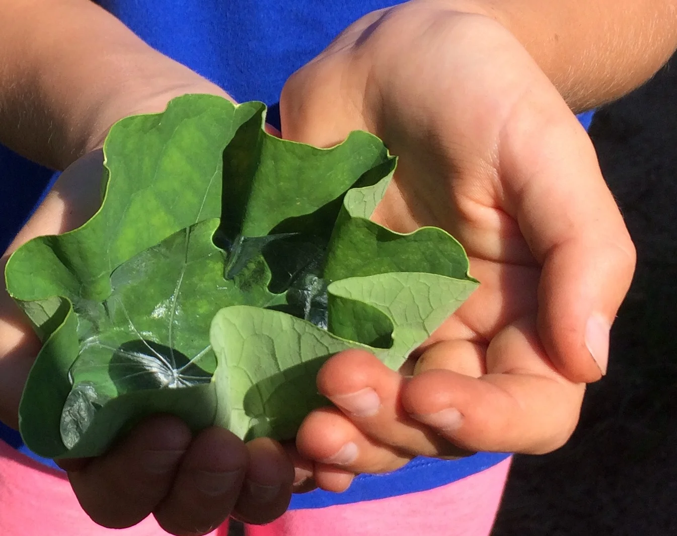 If you and your children have never swirled a drop of water in a nasturtium leaf, you must find a nasturtium plant and give this a try or, ideally, play with nasturtium leaves in the rain as I did recently with a fourth grade class (see video below.) Water drops on these leaves behave in a most unusual way. They don’t thin out and run across the leaf. Rather, they bead up into round transparent balls that roll merrily around the leaf when it is moved.