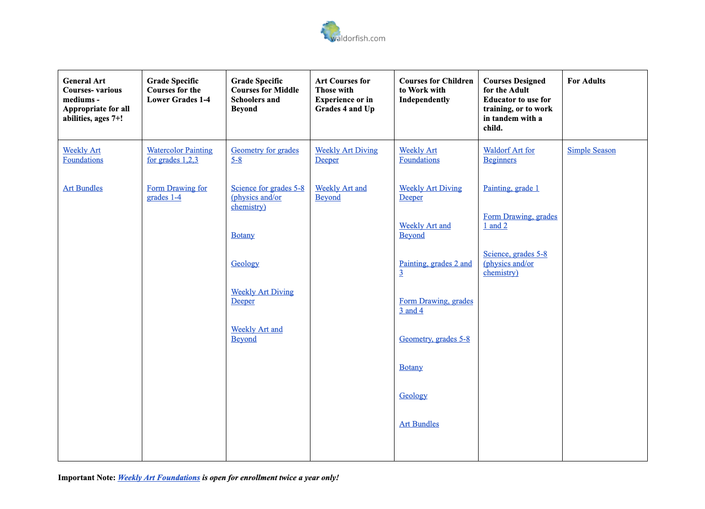 We offer courses crafted by master teachers, all designed with the Waldorf pedagogy and the homeschooling family in mind. Our courses are suitable for a wide range of ages, grades, and abilities, and include subjects in art, science (physics, chemistry, and botany), form drawing, geometry, and festival life.